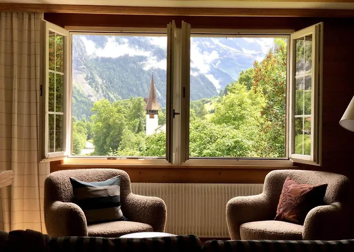 Das 95 m² große Apartment Iconic Valley View Amazing Design King Bed Lauterbrunnen mit Blick auf die Berge liegt in ca. 3 km Entfernung von den Trümmelbachfällen in Lauterbrunnen. Dieses Apartment mit einer Terrasse befindet sich nicht weit entfernt vom Lauterbrunnen.